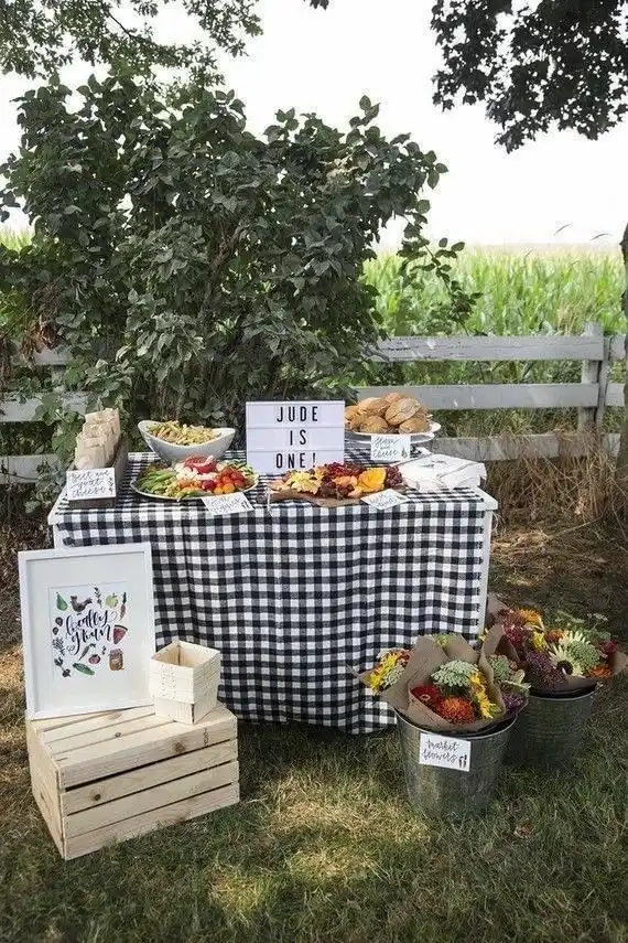 A checkered tablecloth, simple dishes, and some greenery can create a cozy picnic feel. Offer light snacks, fruit, and sandwiches to keep things easy for guests.