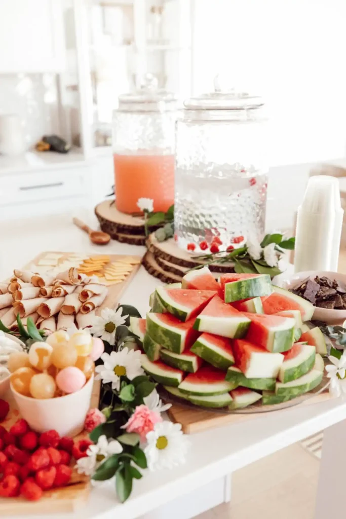 A fruit table adds color and freshness to the celebration. Watermelon slices, berries, and juice jars look inviting and are perfect for hot days.