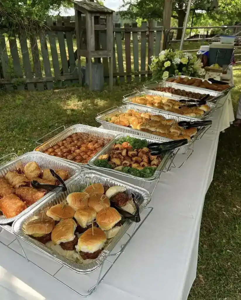 If you have a big guest list, setting up a buffet table keeps things smooth and relaxed. Mini burgers, rolls, and finger foods are perfect for outdoor parties.
