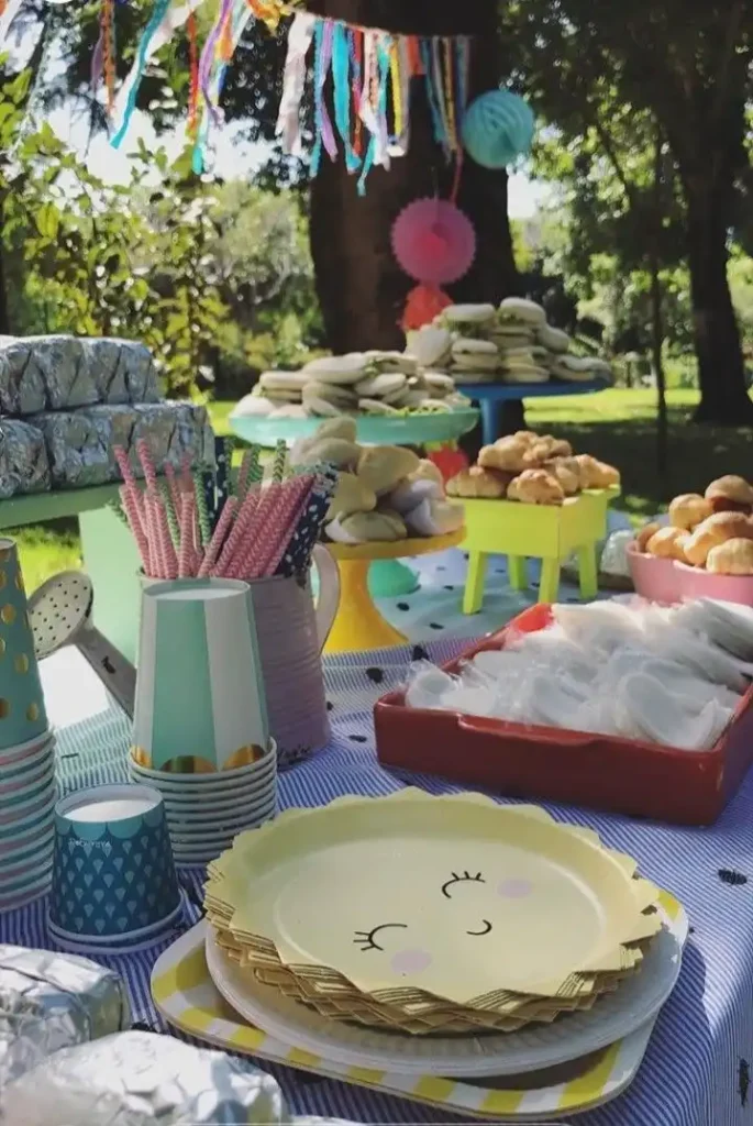 Bright tableware, soft drinks, and a mix of sandwiches and treats bring a cheerful touch to the celebration. Add some paper decorations or ribbons for a lively finish.