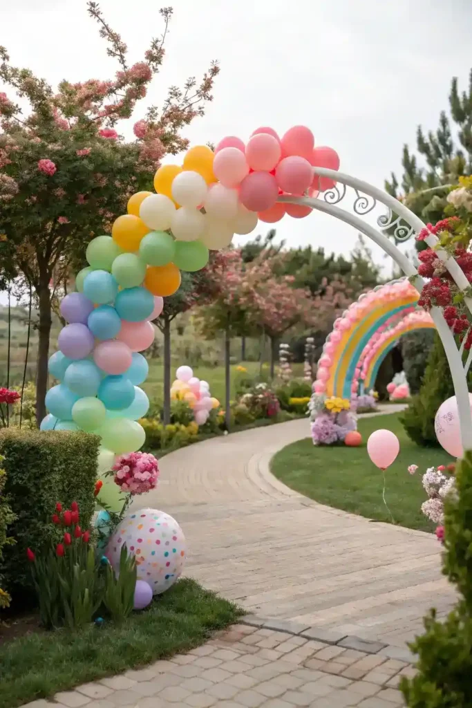 A rainbow balloon arch is such a bright and cheerful way to welcome guests. The soft pastel colors instantly lift the mood and make the space look magical.