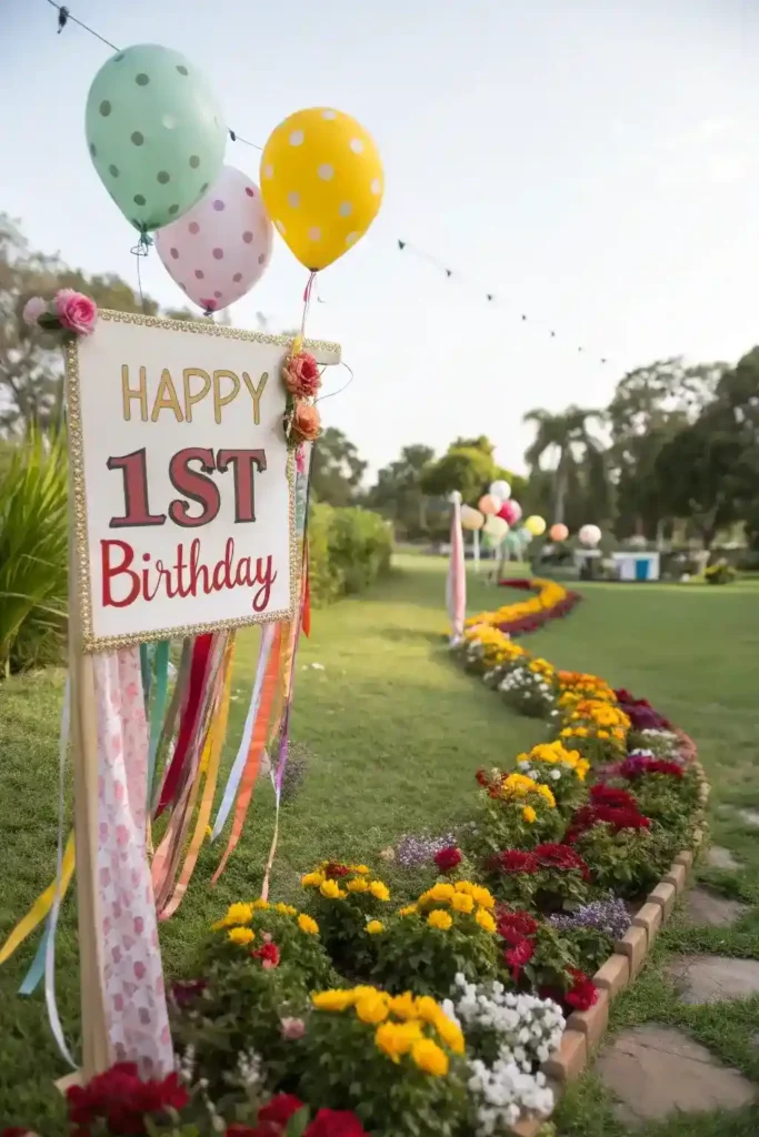 A garden walkway with a birthday sign and balloons feels joyful and inviting. The flowers and soft ribbons add a sweet touch that ties the whole party together.