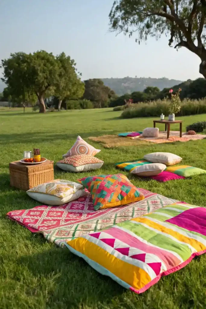 Soft blankets, bright cushions, and a few low tables turn any green space into a cozy lounge. It gives families a place to relax while kids play nearby.