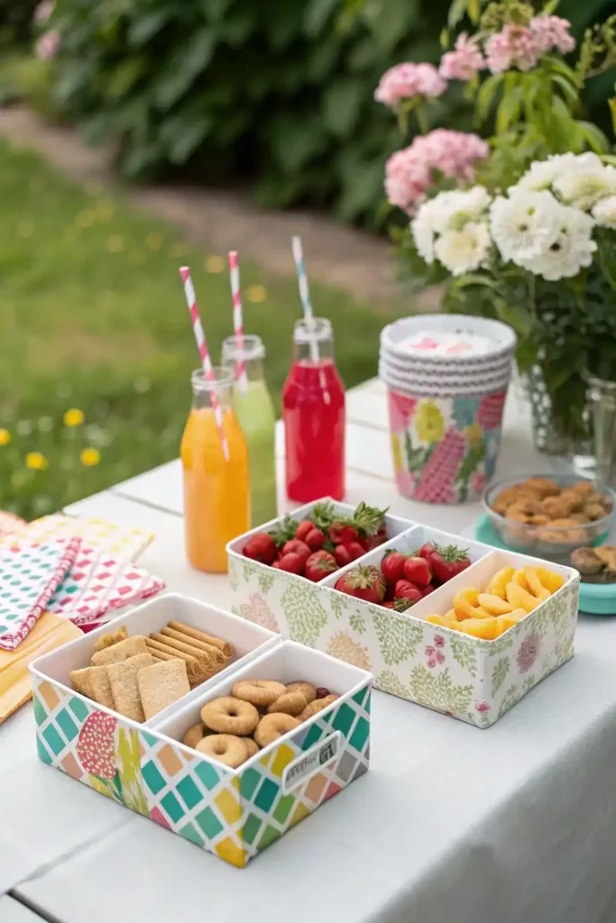 Small snack boxes with fruit, cookies, and juice bottles make serving food simple and neat. The colorful setup keeps the mood playful while giving guests something fresh to enjoy.