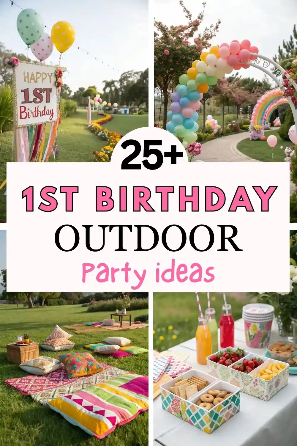 A floral tent setup instantly turns an ordinary backyard into a dreamy space. Soft drapes, pastel balloons, and fresh flowers create a magical feel that suits a first birthday perfectly.