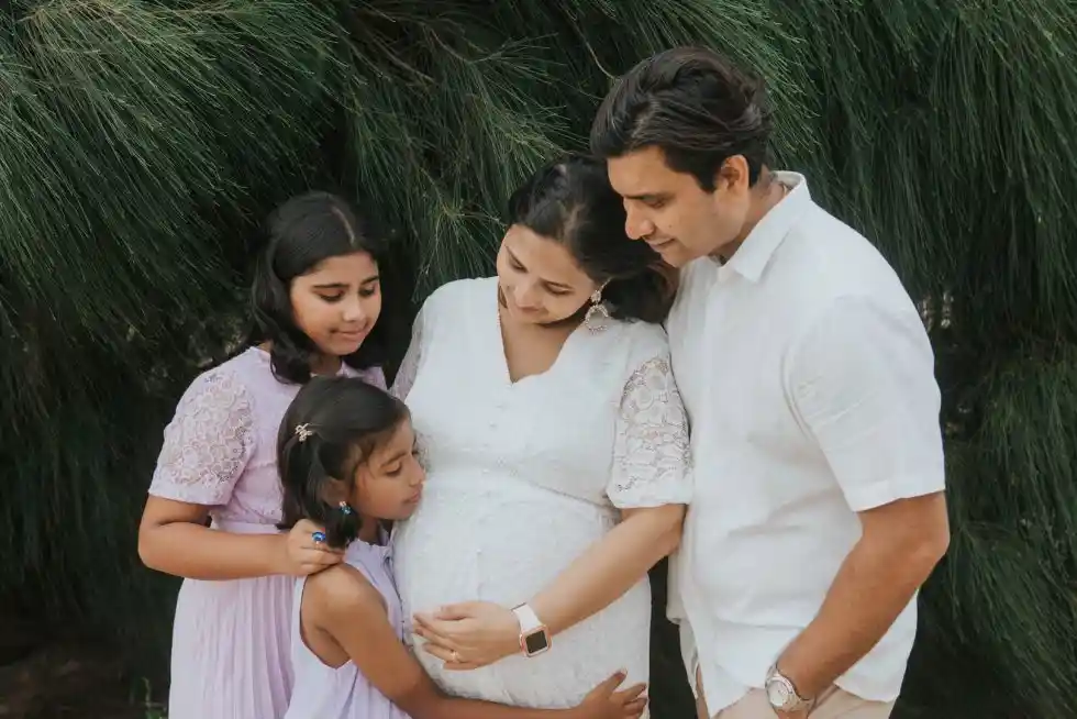 Gathering everyone close for a soft, loving hug around the baby bump creates a touching image that celebrates unity and togetherness.