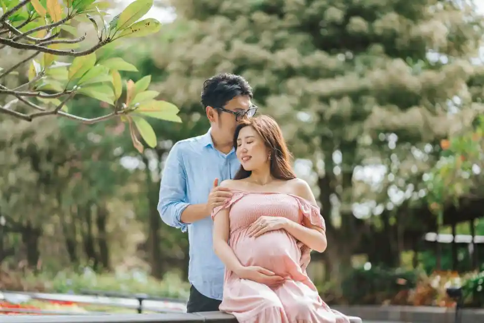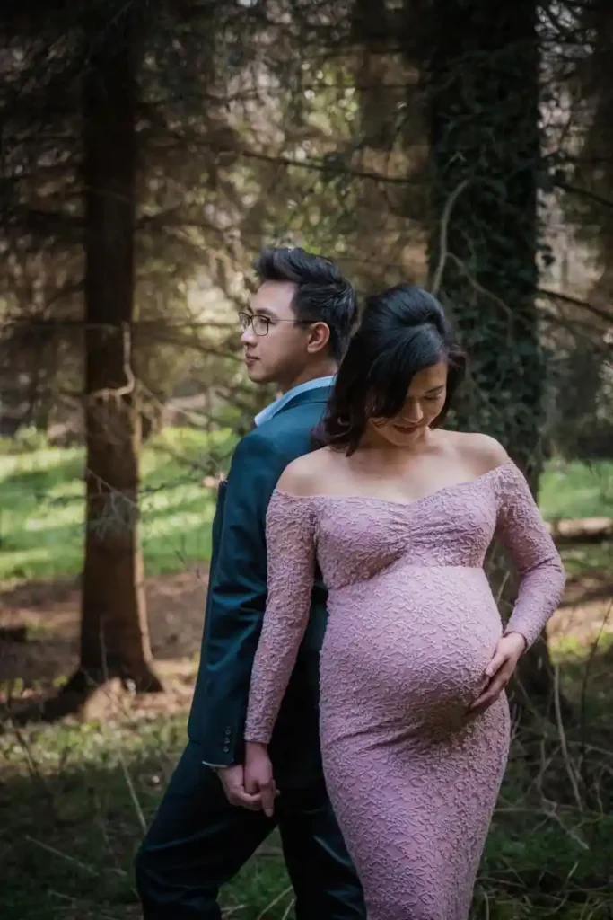 Standing back to back surrounded by tall trees gives a quiet and graceful touch to your maternity shoot. The soft light filtering through the leaves creates a peaceful setting that highlights both strength and tenderness.