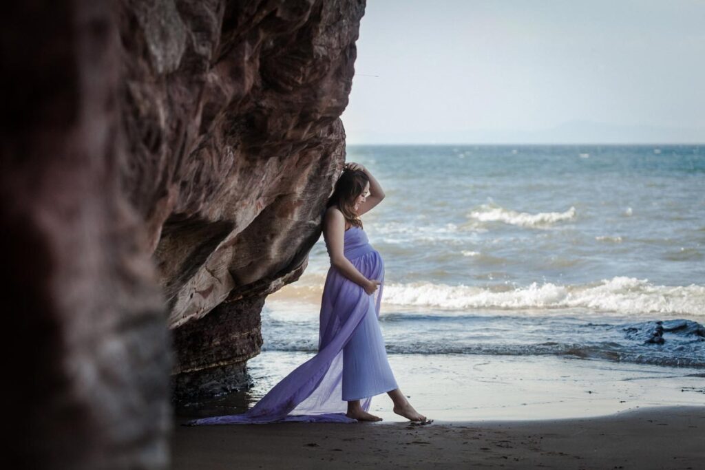 The beach makes a dreamy spot for maternity photos. Leaning gently against a seaside rock with the sound of waves in the background adds calm and natural beauty.