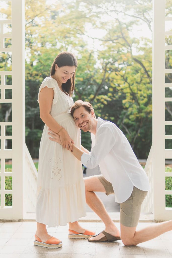 Have your partner kneel and gently talk to the bump. It’s a simple yet powerful way to capture that growing excitement for the arrival ahead.