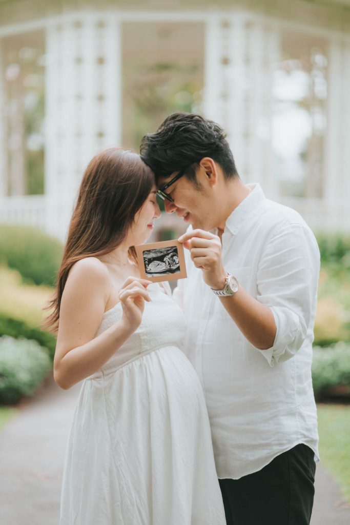 Holding the ultrasound photo between you creates a deeply personal touch. It’s a sweet way to include your little one in the shoot, symbolizing the love and anticipation already blooming before their arrival.