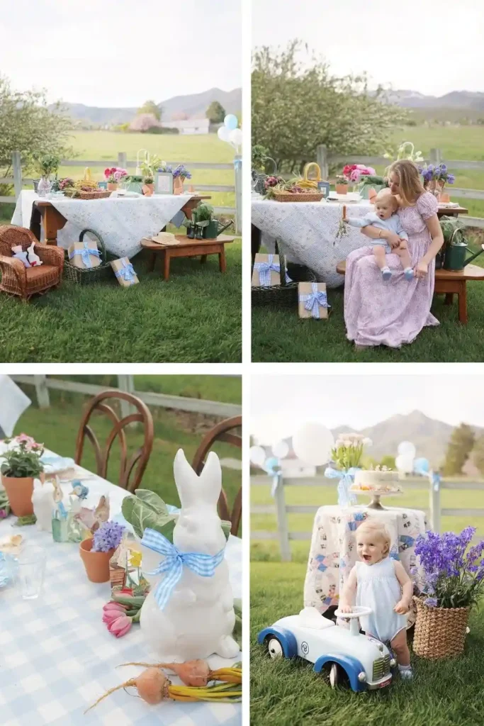 This beautiful idea from Home and Hallow captures the true heart of a Peter Rabbit celebration. The decorations were crafted mostly by hand, combining white serveware, soft blue gingham fabric, and charming garden touches.
