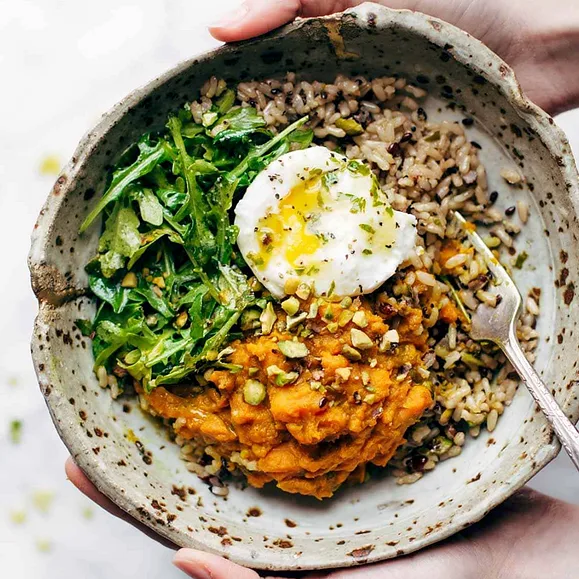 From Bon Appétit, this flavorful dish adds a little kick to your meal plan. We don’t eat kimchi often, but when we do, this is our go-to recipe. Our favorite grain to use is farro, which adds a chewy, hearty texture that pairs perfectly with the tangy kimchi.