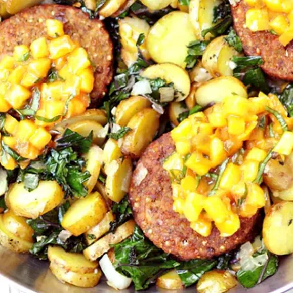 Breakfast Sausage Hash with Basil Peach Chutney