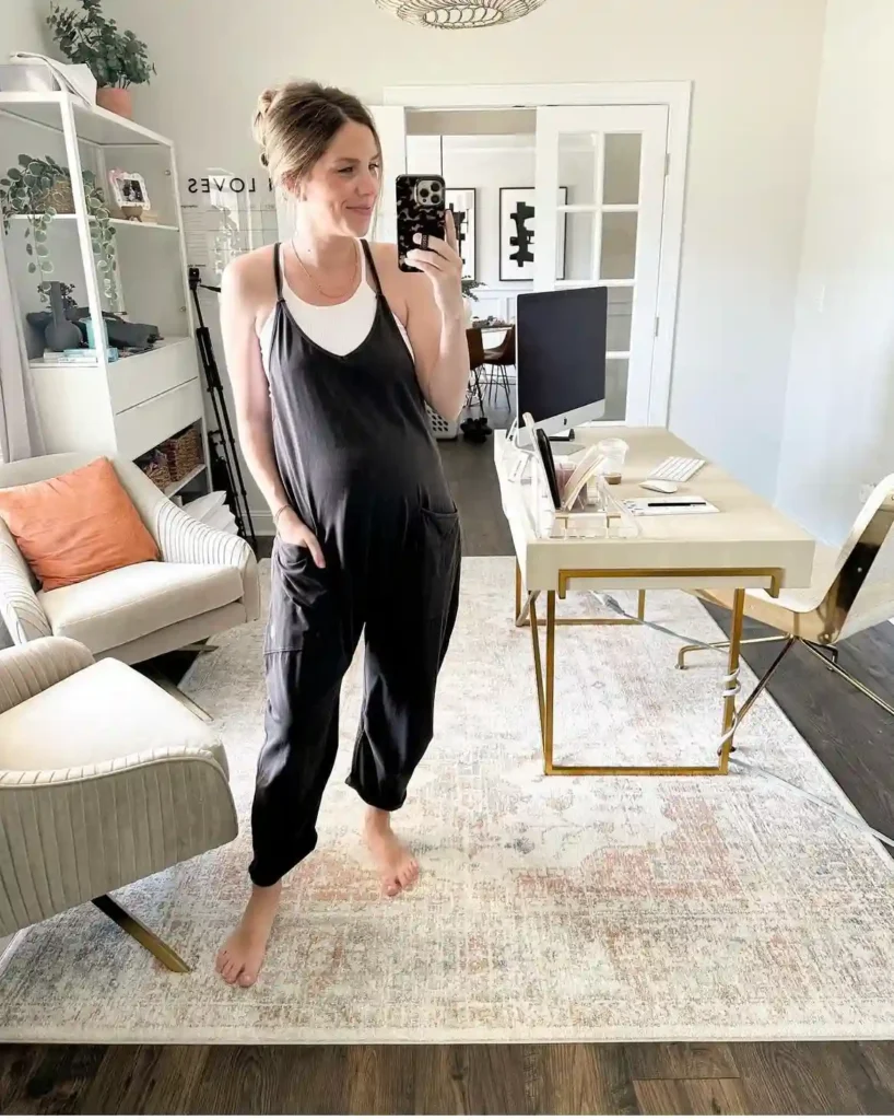 For those relaxed winter days at home, it’s hard to think of an outfit more comfortable than this one. Slouchy dungarees are the ultimate in cozy wear. Style them with a vest or a long-sleeve top underneath for extra warmth. If you are nursing, this is a great choice that keeps you comfortable while still flattering your shape.