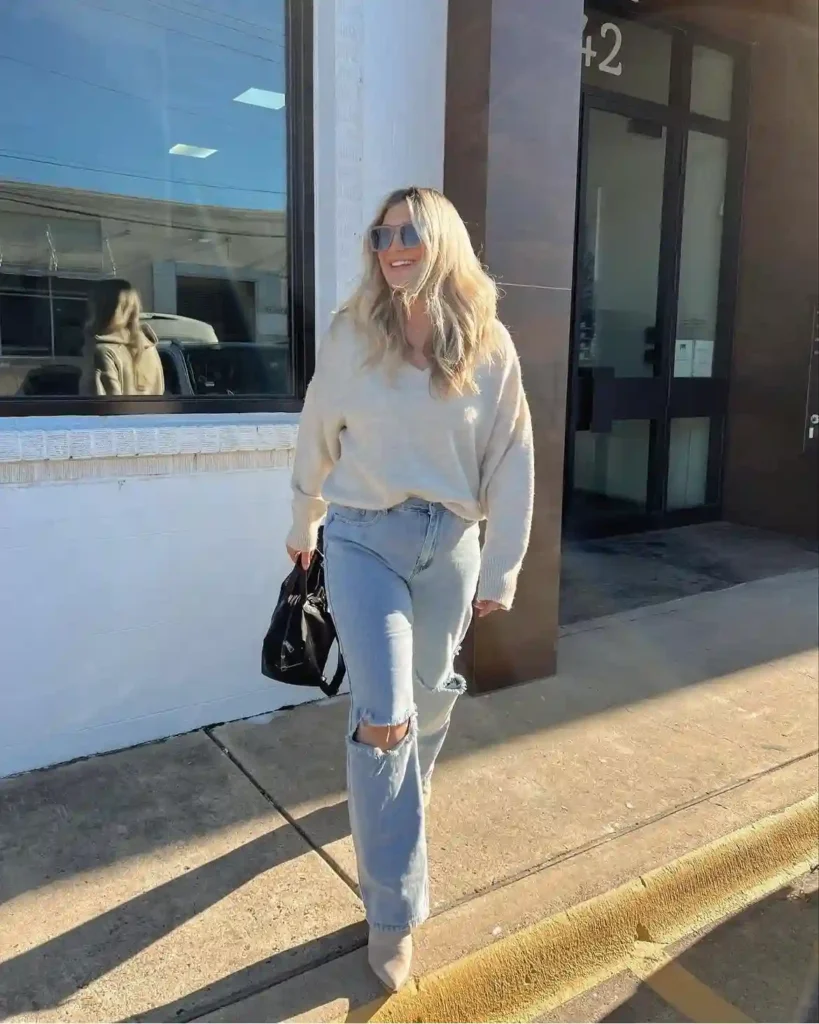 This stylish winter outfit feels wonderful for a postpartum body and brings back that look-good, feel-good energy. Flared jeans paired with heeled boots or Uggs are right on trend for 2024 and beyond. Combine them with a soft, slouchy jumper and tuck it gently into the front of the jeans to give some shape. The V-neckline shows just a little skin, creating a beautiful full-length look.