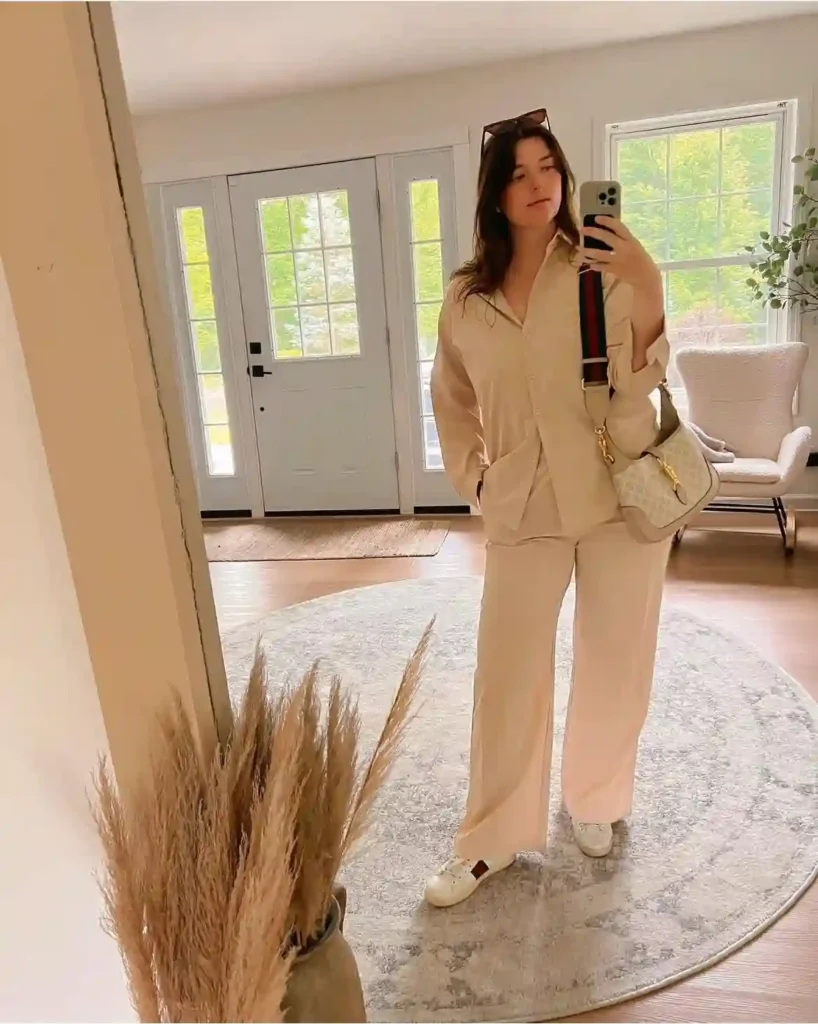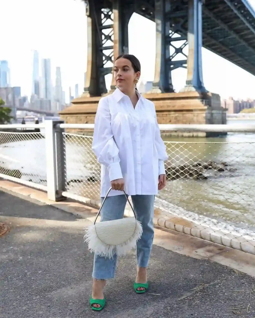 A crisp white shirt is a timeless piece that can instantly elevate your wardrobe. The right one will lightly skim your body while adding structure and polish. Choose a looser, flowy white shirt that works beautifully both postpartum and beyond. Look for small details like cuffed sleeves that subtly draw attention and add charm to the outfit.
