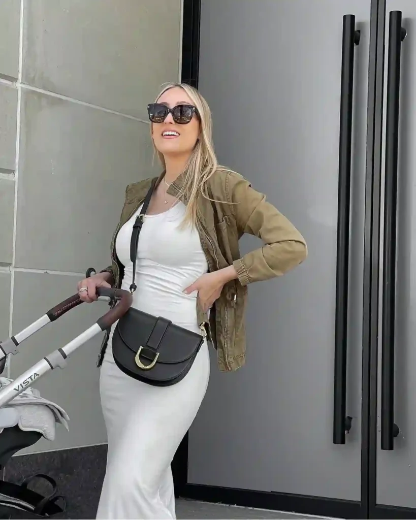 Learning to love your postpartum body is important, and there’s no reason to shy away from body-hugging styles. A stretchy maxi dress brings comfort and confidence in one. Pair it with a chic shacket for extra warmth, and you can easily dress it up or down depending on your plans.