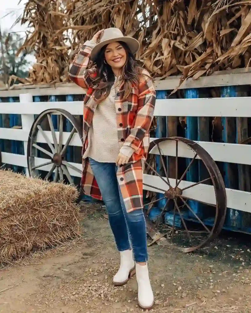 How cozy is this look? It’s the perfect outfit to take you from a pumpkin patch outing to Thanksgiving with family. Layering is the secret to feeling warm while staying stylish. Choose a slightly longer jacket or coat and pair it with a soft jumper underneath to create a flattering, elongated shape.