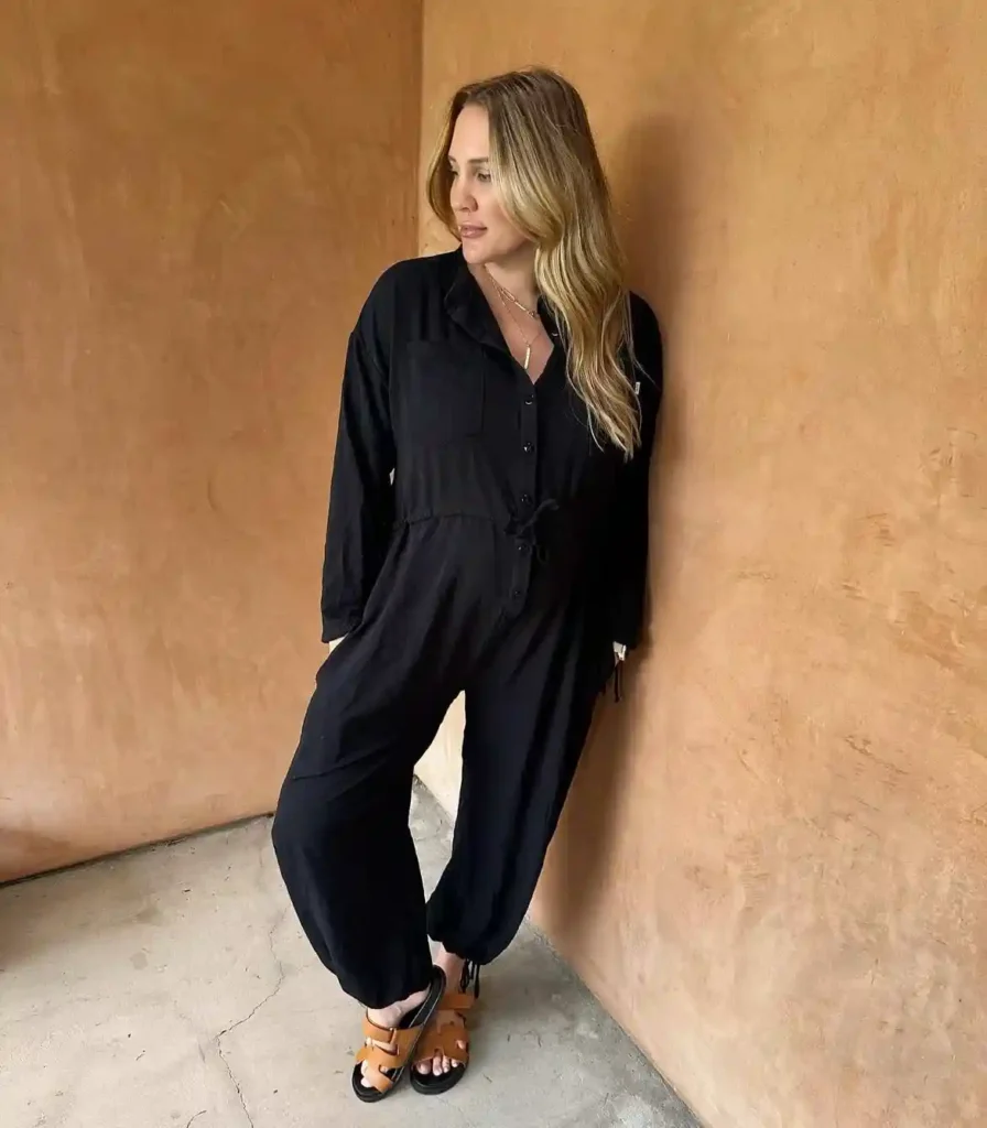Here’s another outfit idea you’ll want to wear on repeat because it feels so good to be in. A black long-sleeved romper is comfortable, easy to move in, and hides little messes effortlessly. Layer it with a cozy coat when heading out to keep warm while still looking chic.