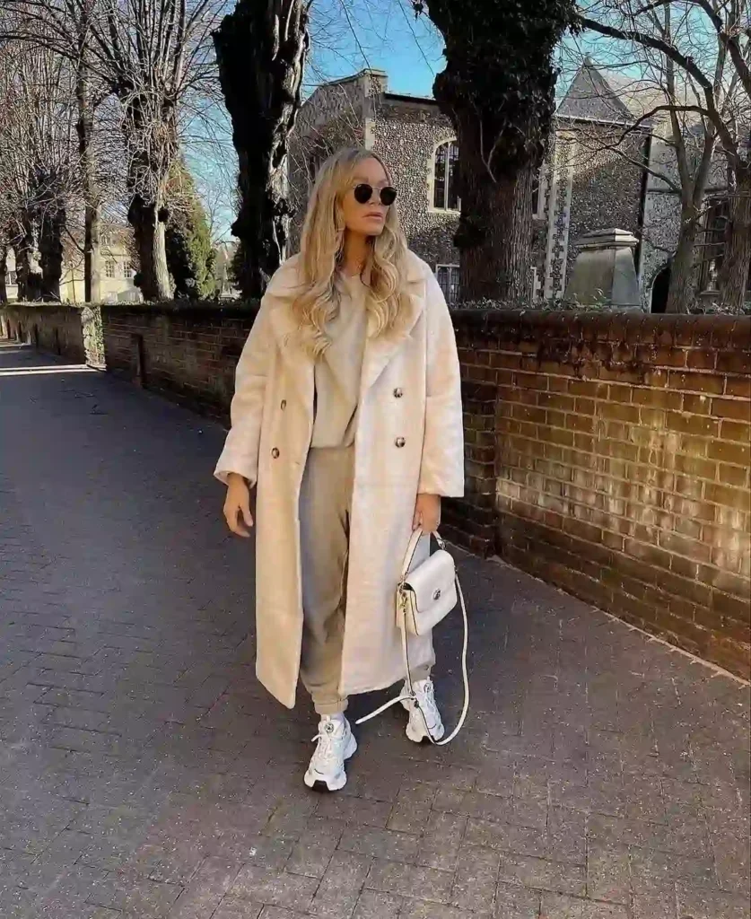 Combining casual and polished pieces creates one of the best winter styles for moms. Wear a comfy matching tracksuit underneath and top it with a long winter coat to add structure and texture. Finish the look with your favorite sneakers and a pair of stylish sunglasses to tie it all together.