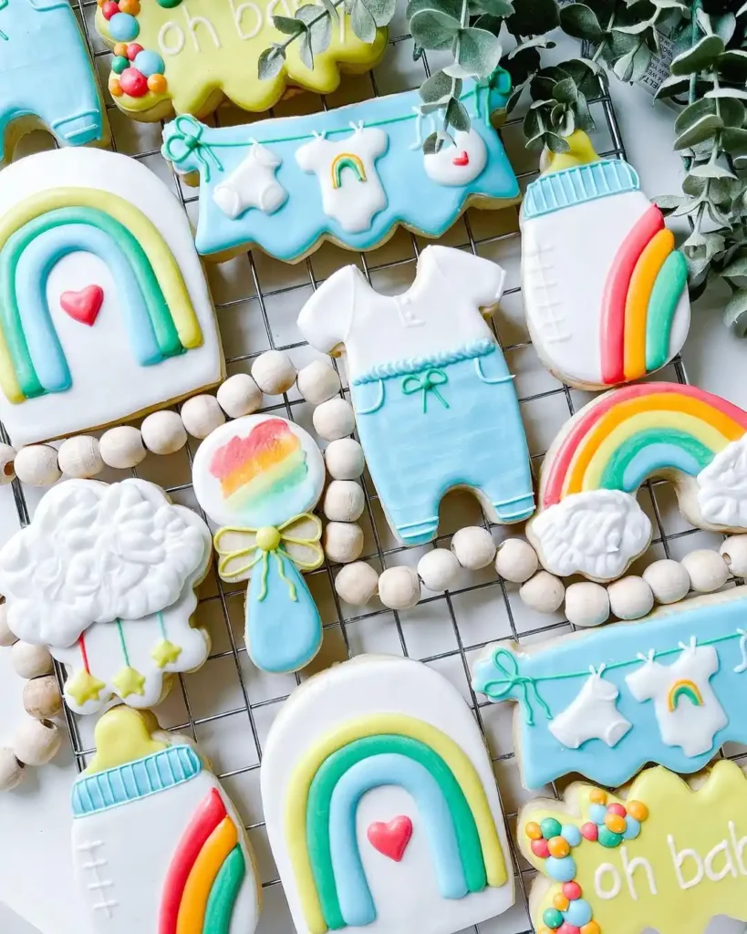 Here’s a sweet and creative way to celebrate your rainbow baby. Order or make custom sugar cookies with rainbow designs or baby details.