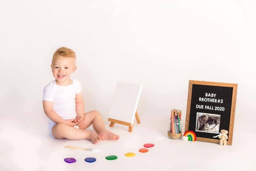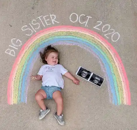 Let your little one draw a bright rainbow on the ground and hold up the picture to share the happy news. It’s simple, creative, and captures the pure joy of sibling love.