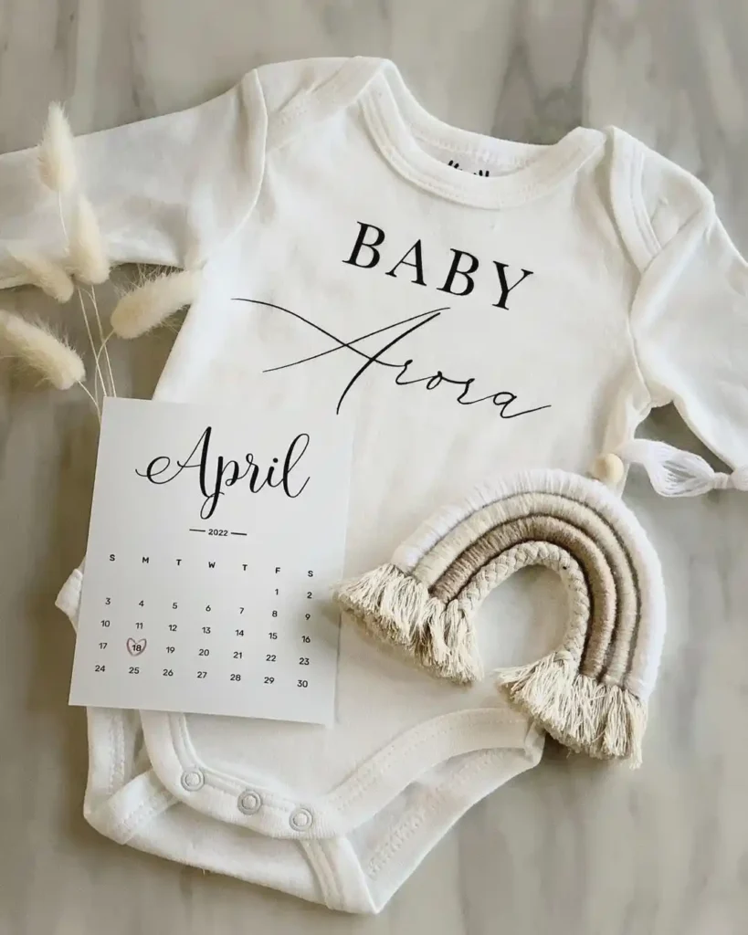 For something calm and elegant, create a neutral flat lay announcement. Gather a custom baby name onesie, a small printed calendar showing your due date, and a macrame rainbow.