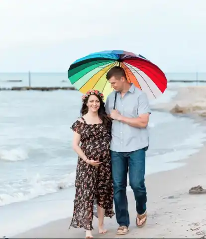 The photo is cheerful and full of meaning, capturing both the joy of pregnancy and the beauty of the journey that led there. Plus, that baby bump makes the picture even more adorable.