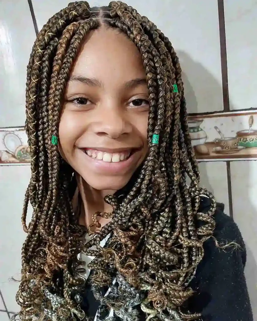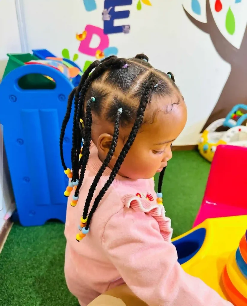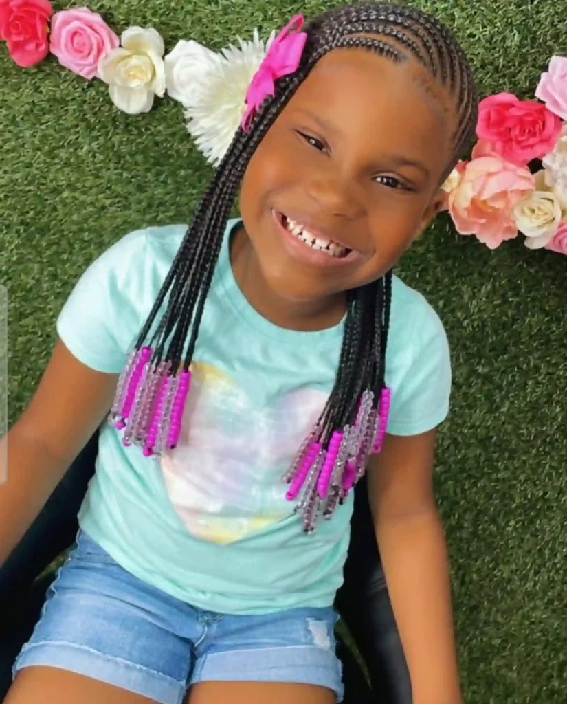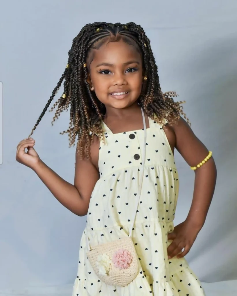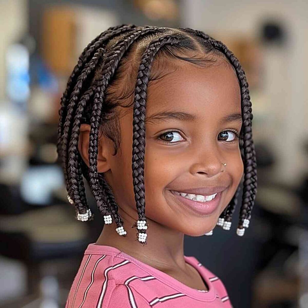 If you’re tired of straight-down box braids, try this creative side-swept version decorated with cute accessories. These braids give your child a fun, confident look that feels fresh and expressive, letting their personality shine through.