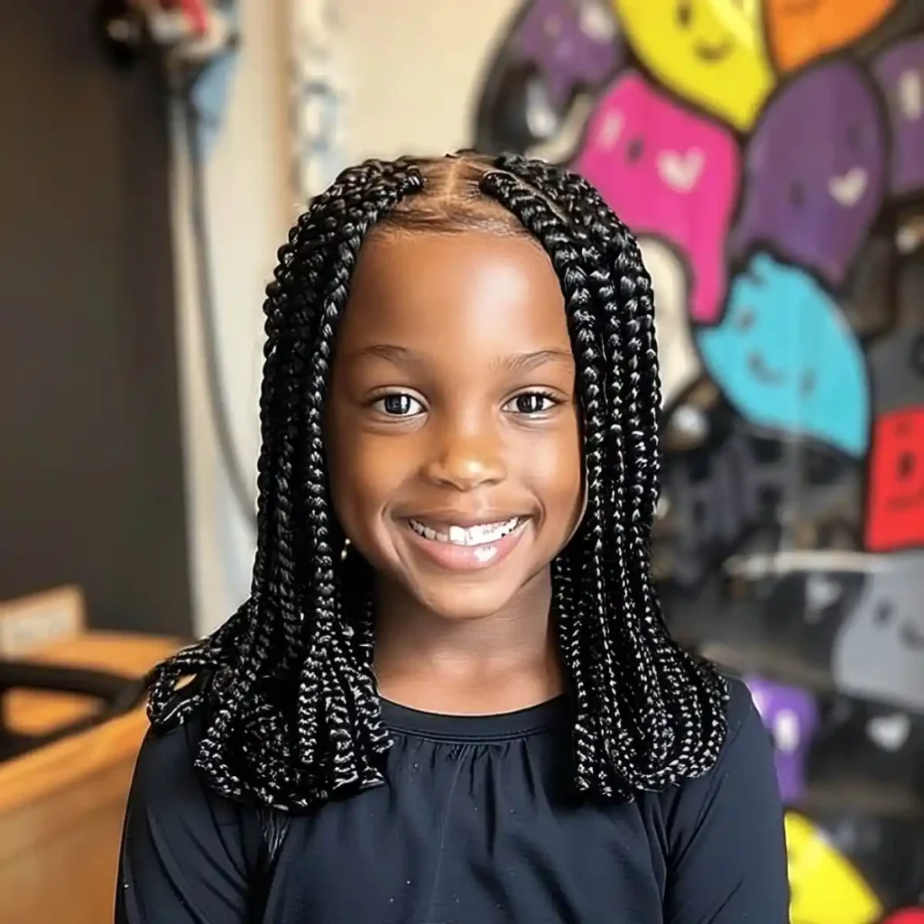 Keep your little girl’s hair looking full and healthy with this easy-to-maintain style. Long box braids let her play with fun accessories like colorful beads or clips, making everyday styling more exciting.