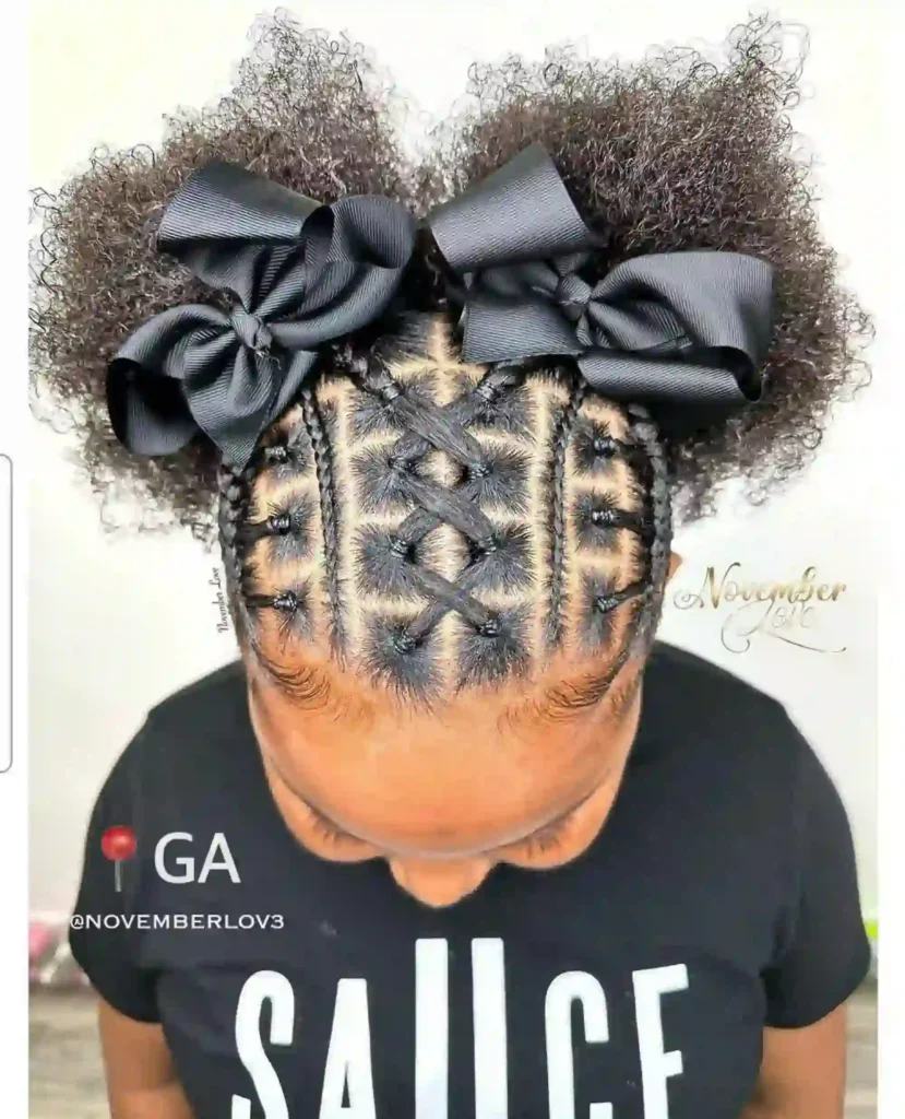 This detailed hairstyle features two puffs and crisscrossed braids that highlight the beauty of your little girl’s natural hair. Add matching ribbons to tie the look together for an extra-cute finish.