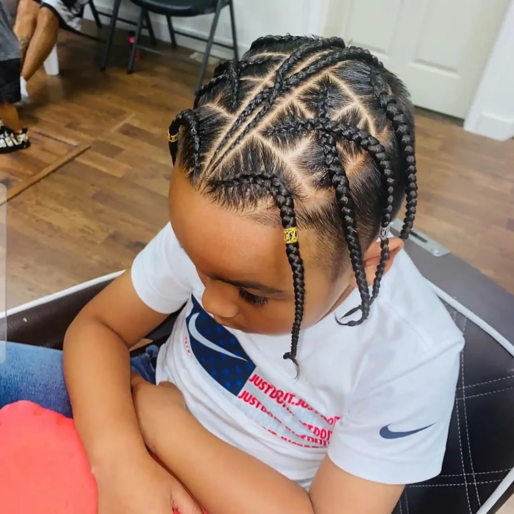 This adorable hairstyle features a star-shaped parting that makes it stand out beautifully on little boys. The clean stitch braids are neat, trendy, and perfect for an everyday look or special occasions.