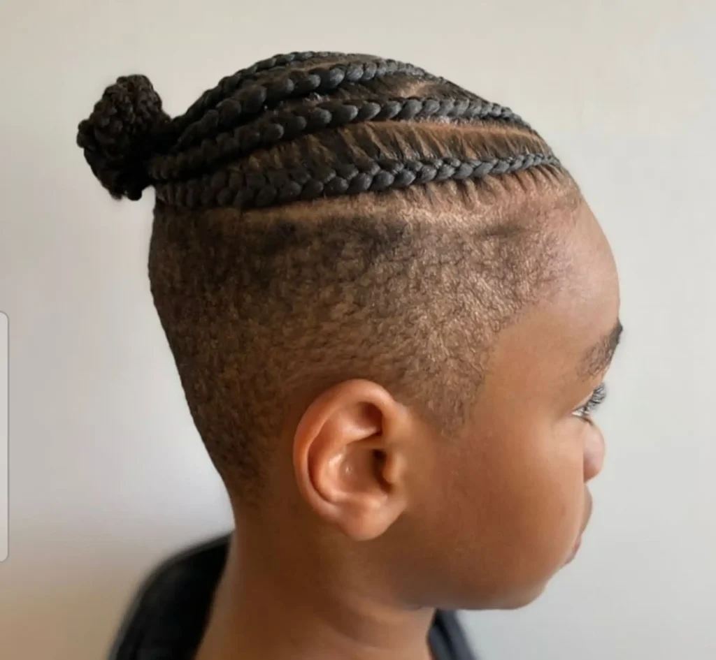 With cornrows that cross over each other and cleanly shaved sides, this hairstyle gives your little boy a bold and standout look. It’s modern, sharp, and full of personality.