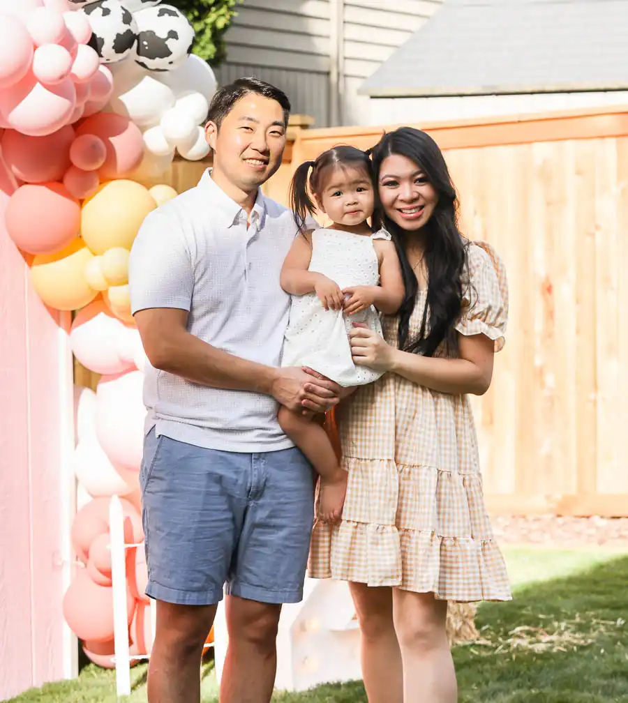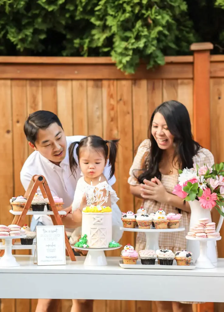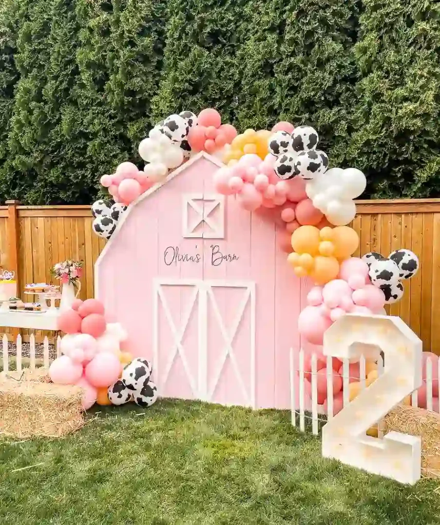 The decor highlight of the party was the pink barn backdrop, which Melissa from Bibas Events created along with the balloon garlands that included a touch of cow print balloons. The setup also featured a light-up number two sign that tied everything together. For the backdrop, we DIYed a few details too. I made Olivia’s Barn vinyl decal using my Cricut and repurposed mini fences that had previously been used in our backyard. I painted them white with leftover paint from our playhouse makeover, cut them into thirds, and used them as decor. We also picked up hay bales from Michaels, which really helped bring the barn theme to life.