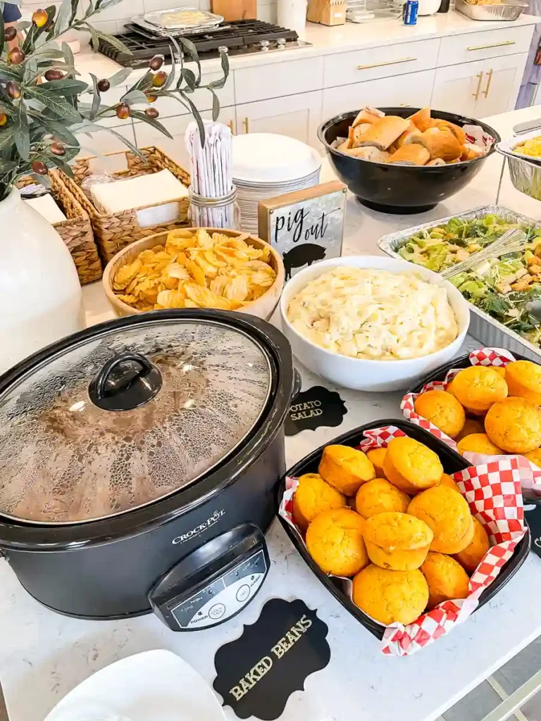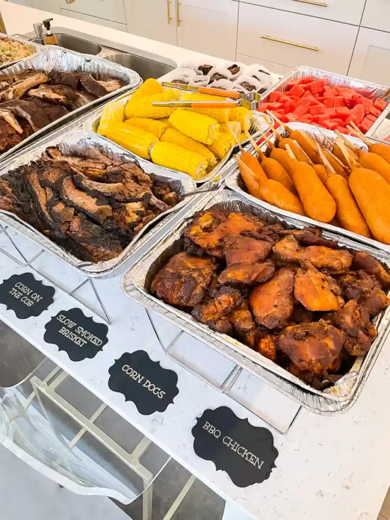 To keep things on theme, we catered the main food from Smokin’ Pete’s BBQ. The menu included brisket, pork ribs, BBQ chicken, mac and cheese, garlic mashed potatoes, corn on the cob, and cornbread. Everything was so flavorful and a big hit with our guests. We also added a Costco run to round things out with Caesar salad, baked beans, potato salad, corn dogs, watermelon, and brownies. It turned into a full feast, and guests even went home with leftovers.