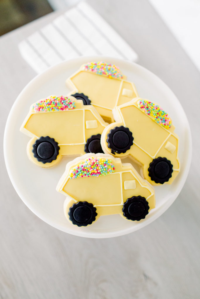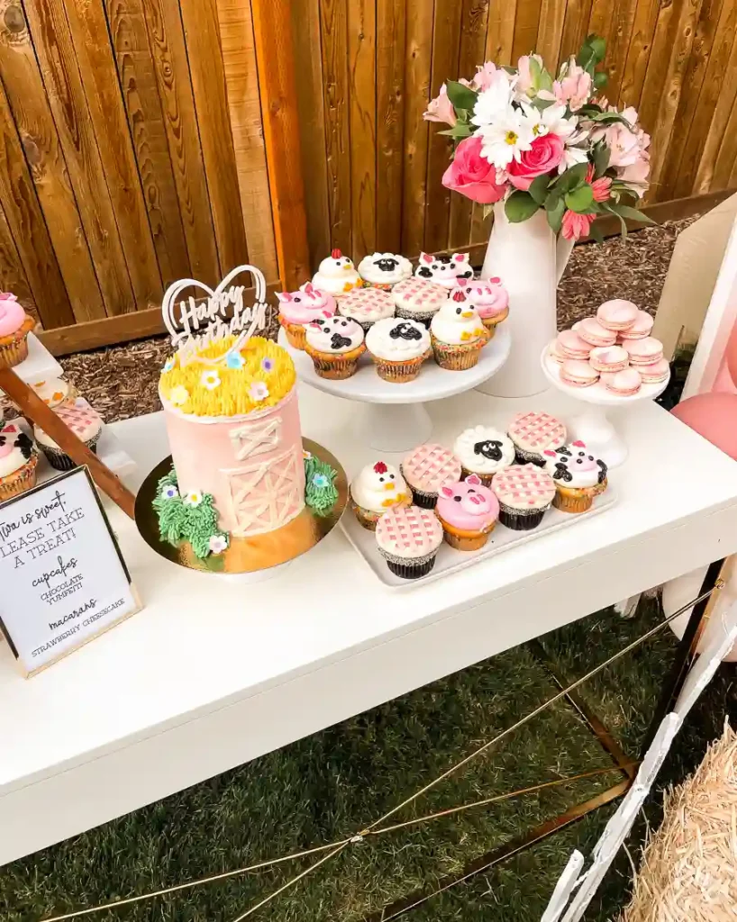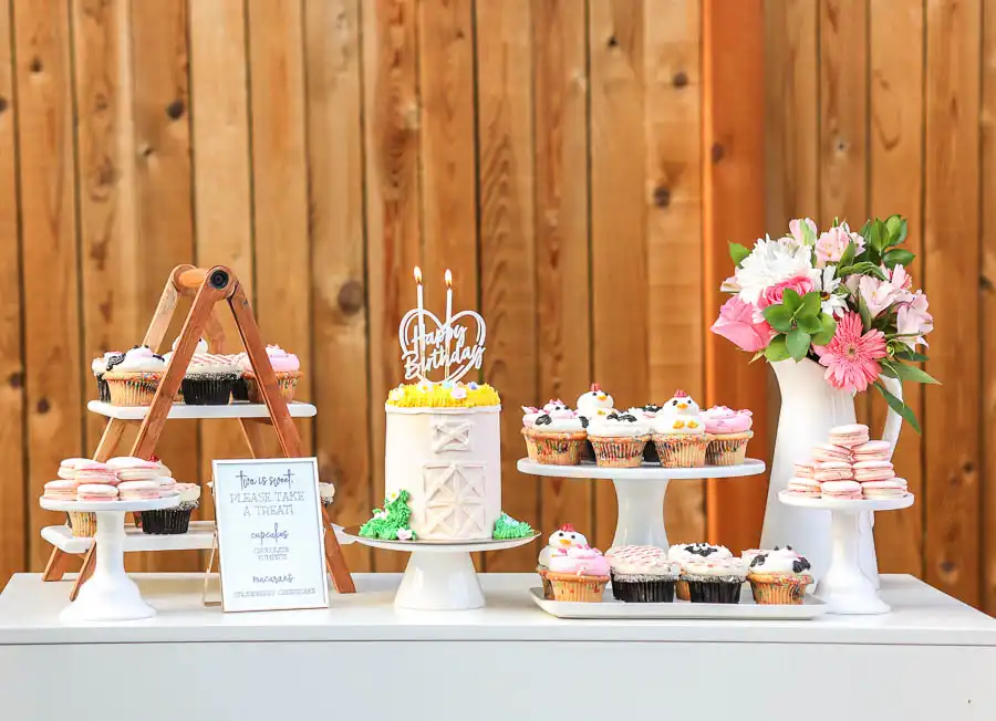 For dessert, Trophy Cupcakes made the sweetest custom pink barn cake along with matching gingham and barn animal cupcakes. The cupcake flavors were Yumfetti and chocolate, and the macarons were strawberry cheesecake. Everything was rich and delicious. To display the desserts, I flipped my desk around so the drawer handles were hidden and used it as a table. I added cake and cupcake stands in different sizes and made a sign that read two is sweet, please take a treat.