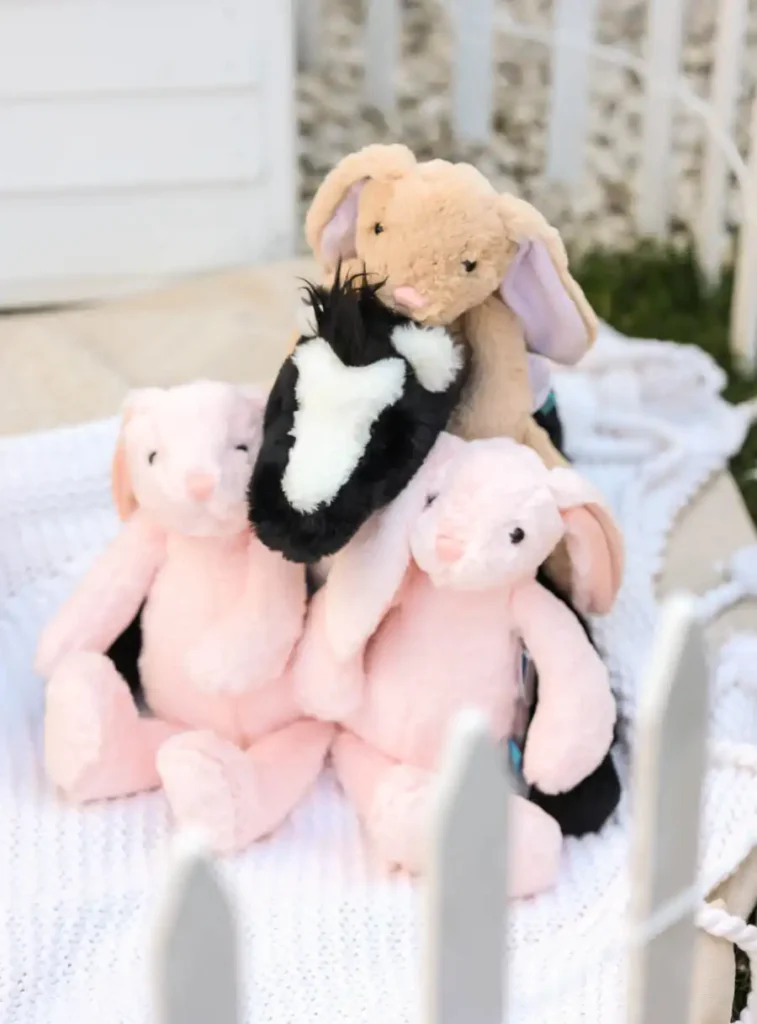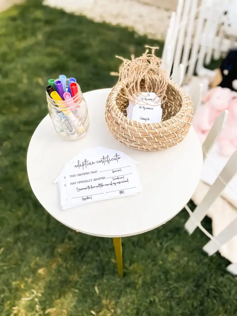 Using our playhouse as a backdrop, I set up an adopt a Farm Animal station with stuffed animals from Manhattan Toy. The plush animals were incredibly soft and adorable, including bunnies, horses, corgis, and lambs. I also created name tags and adoption certificates using my Cricut, which made the favors feel extra special. It was such a fun and memorable takeaway for the kids.