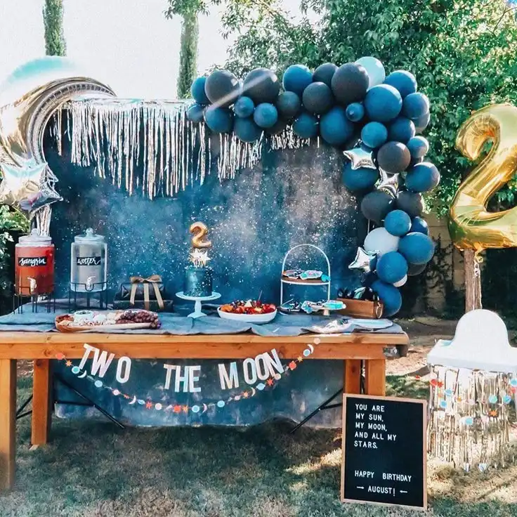 A space-themed second birthday always feels a little magical. Stars, moons, and soft celestial colors create such a dreamy setup. This theme works beautifully for daytime or evening parties and pairs well with simple decorations that still feel special and imaginative.