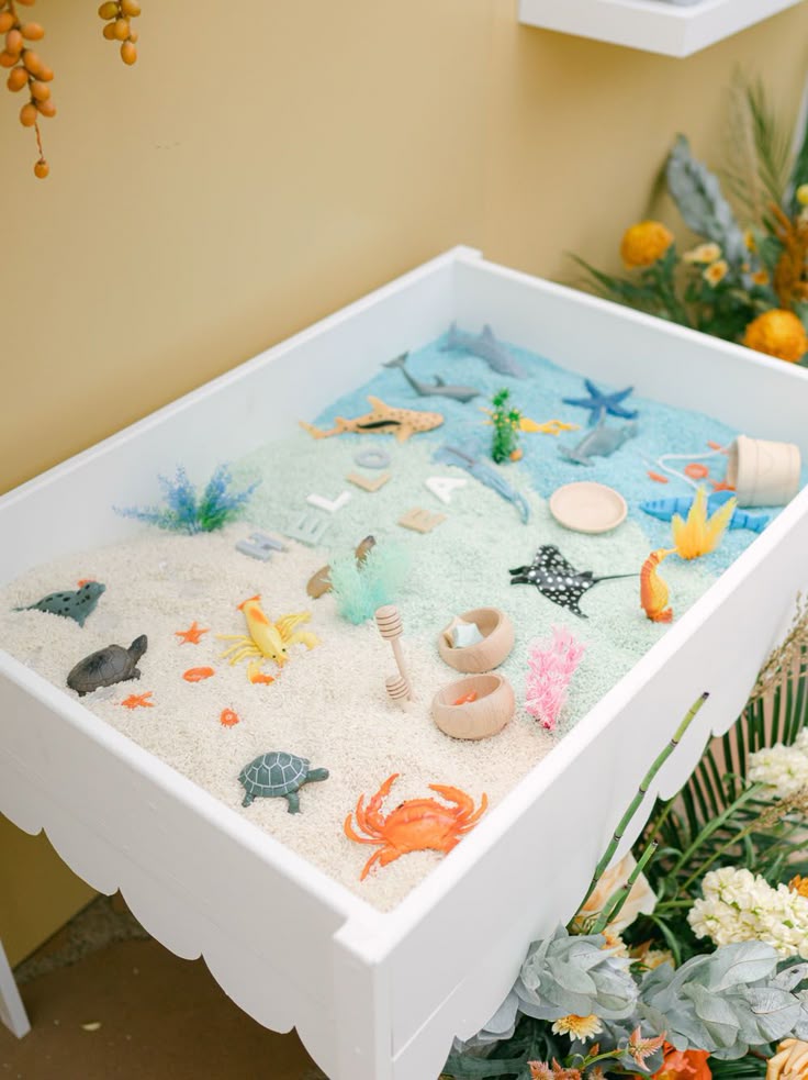 This ocean-inspired theme is a little more open-ended and can be styled in different ways. You can keep it classic with sea creatures or lean into a more nautical look. Details like fish nets for photo displays and ocean-themed sensory activities make this a great option for curious little guests.