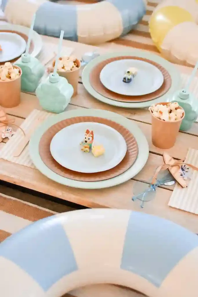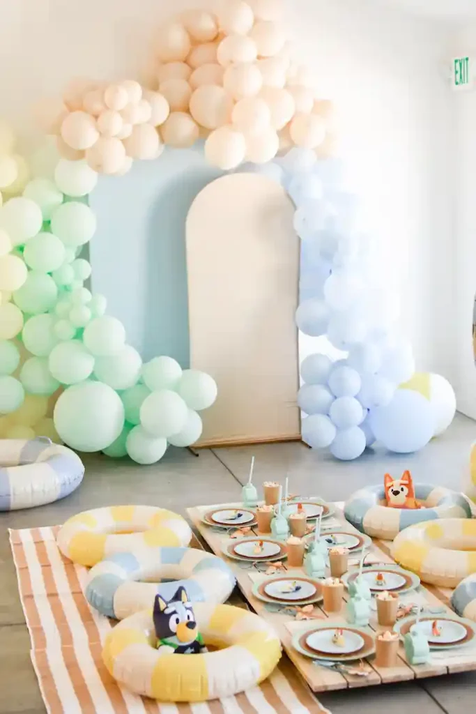 A Bluey-themed party is always a crowd favorite and can be styled in a really cute, aesthetic way. Beachy colors and playful details work beautifully here, and there are lots of fun wording ideas you can use to personalize the theme. It feels relaxed, cheerful, and very on brand for a second birthday.