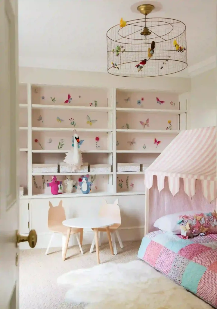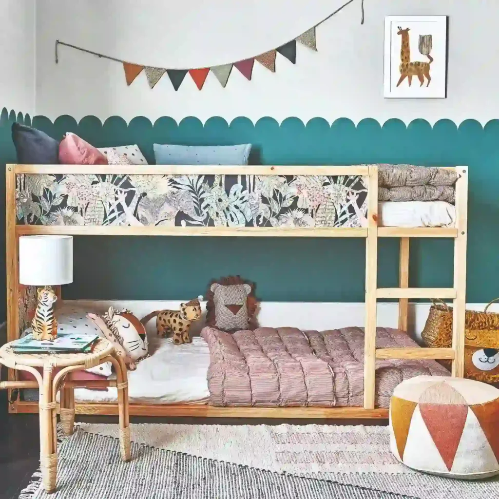 When floor space is limited, make the most of the walls. Incorporating vertical decor and storage can completely change how a small kids’ room feels. Wall art, shelving, and themed accents can add both personality and function. “Themed bedrooms are a fun way to create a space that reflects your child’s interests and personality,” says Sally Jackson, founder of Soren’s House. “There are designs to fit every style, from nature and animals to outer space. To make the look last, keep walls neutral and use accessories, wall hangings, and bedding to bring the theme to life.” She adds that decorative pieces like the paper insects shown above can easily be swapped out as your child grows. They can also be passed on, reused, or donated when it’s time for a room refresh.
