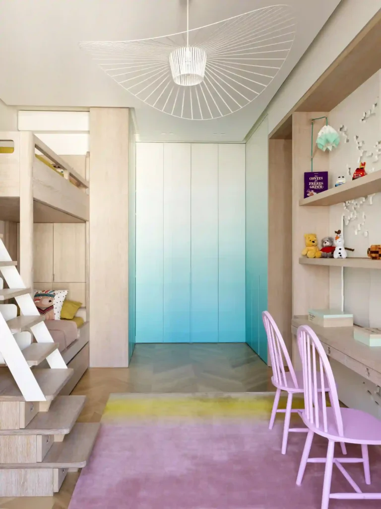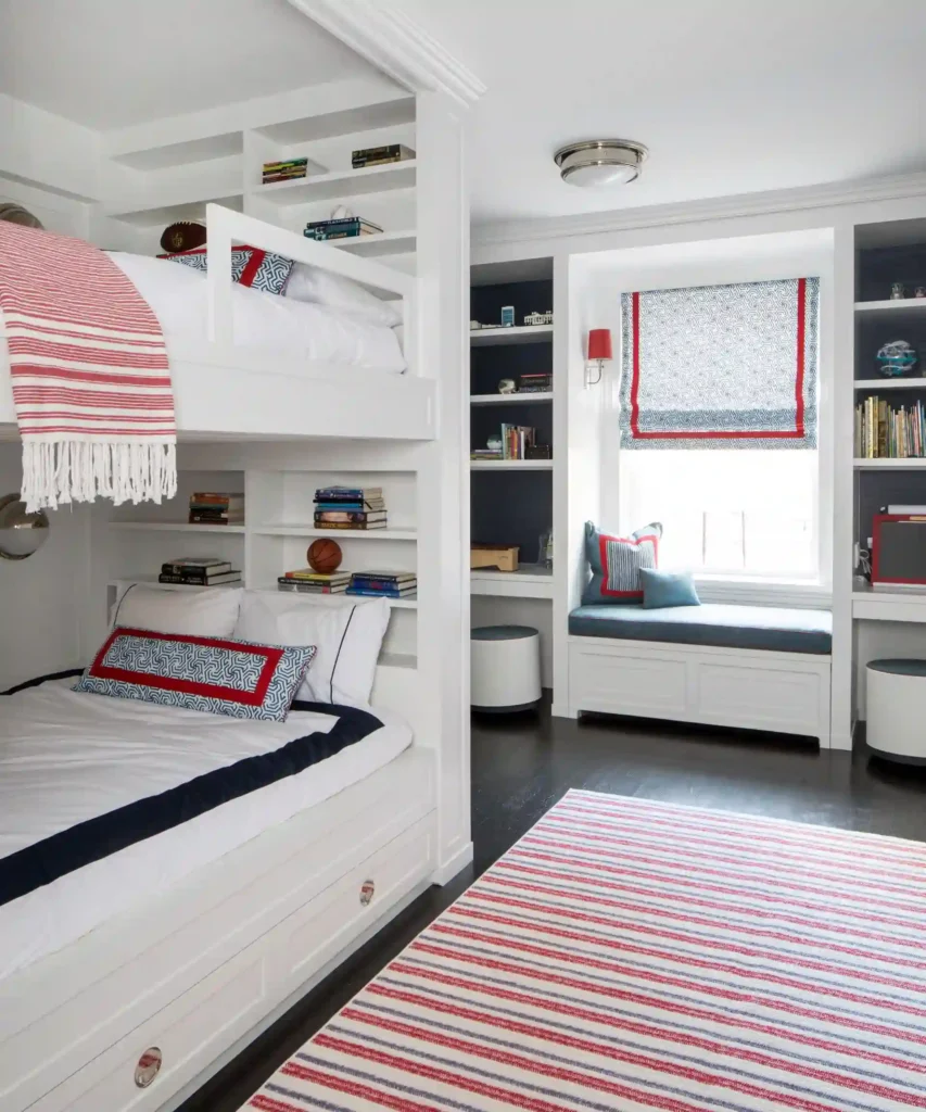 Designer Sarah Jefferys of Sarah Jefferys Architecture + Interiors explains, “In smaller rooms, I love including a bunk or loft bed that combines sleeping areas, shelving, and even a small desk. When designed well, you barely need any other furniture in the room.”