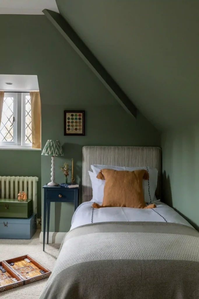 “These attic rooms have a cocooning feel,” says Katie Lion, senior interior designer at Kitesgrove. “We highlighted the mustard tones in the headboard with matching cushions and blinds, then added contrast with deep green walls. The mix adds depth and warmth to the entire space.”