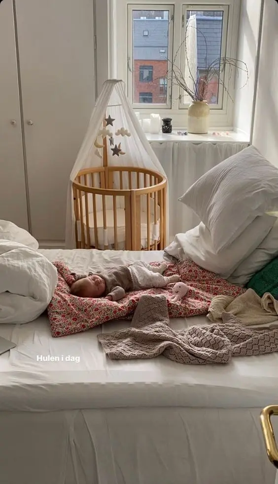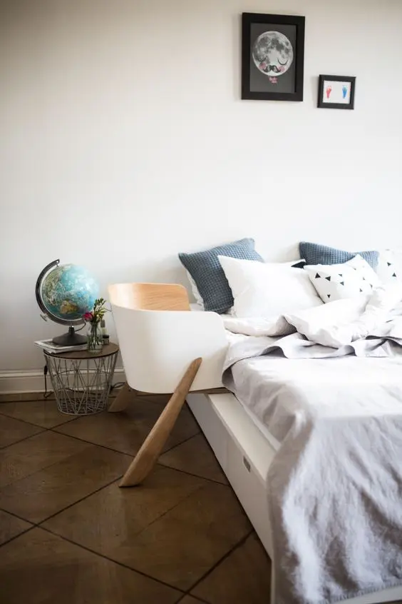 A small wooden bassinet tucked right against the bed keeps baby within reach while blending seamlessly into a modern bedroom style. Its compact size works perfectly for parents who want a minimalist look with maximum function.