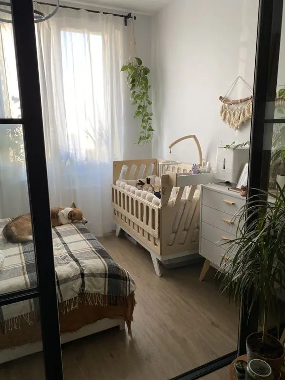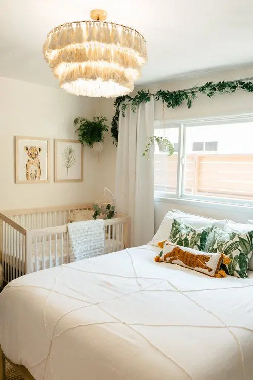 Adding greenery around baby’s crib instantly makes the space feel fresher and more vibrant. A garland above the bed or a potted plant near the crib brings a calming, natural element to your nursery-in-bedroom setup.