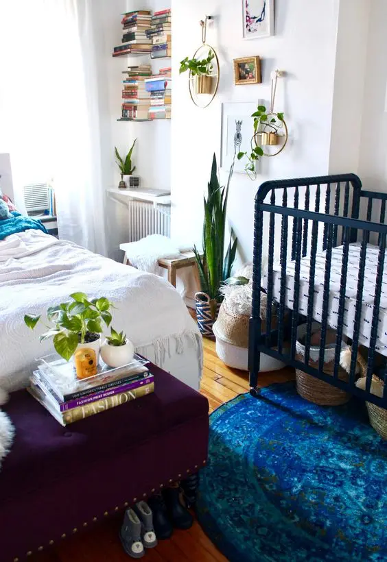 Pairing a dark crib with bold rugs, greenery, and shelves of books creates a nursery space full of personality. This design proves you can have a vibrant, playful setup for baby without sacrificing your own bedroom’s aesthetic.