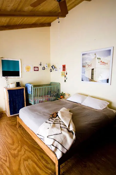 A wooden crib paired with eclectic wall art and rustic floors brings a touch of vintage charm to the bedroom. It’s a casual yet personal way to carve out space for baby while letting the room’s character shine.