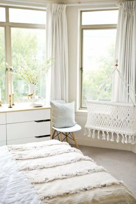 For a dreamy, boho feel, a hanging macrame bassinet is both practical and beautiful. It saves floor space, adds visual interest, and gives your nursery nook a unique handcrafted touch.