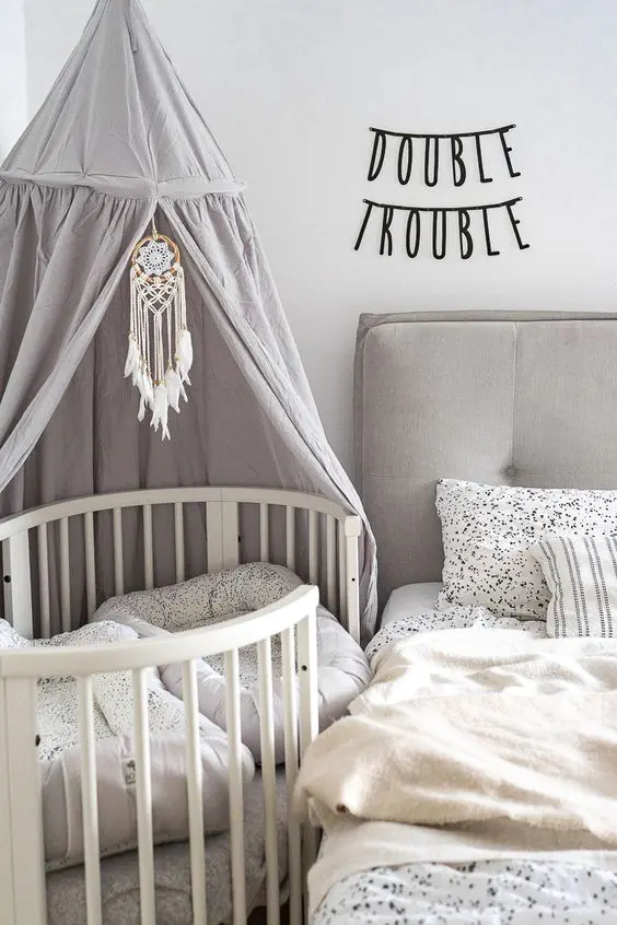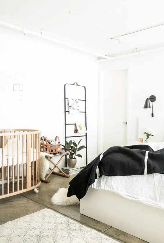 A round crib topped with a delicate canopy adds a touch of softness to your bedroom. The shape saves space, and the canopy creates a dreamy, cozy corner that feels like its own little nursery nook.