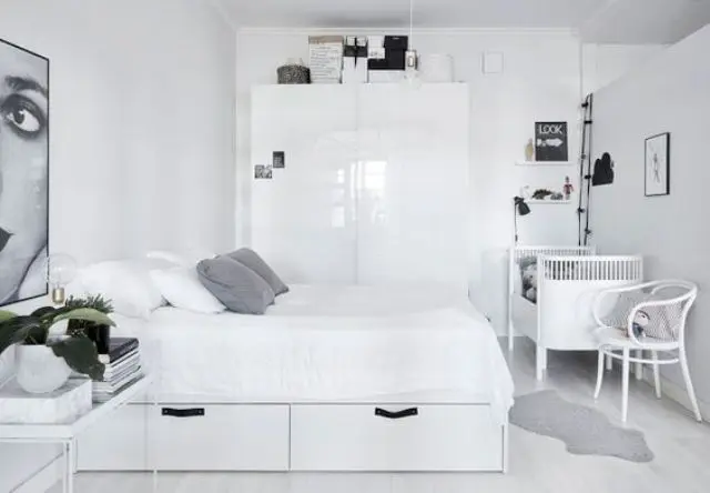 A crisp white crib paired with streamlined furniture and monochrome decor keeps the nursery corner looking fresh and modern. This look works especially well in small bedrooms where simplicity is key.